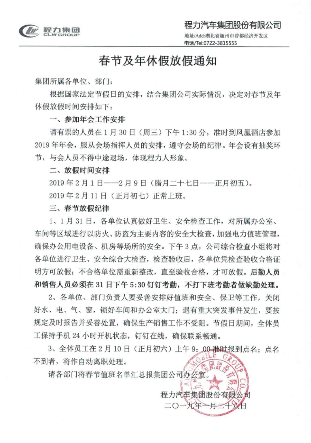湖北程力集團經公司各部門商議決定,2019年春節假期從2019年2月1號(農歷2018年臘月27),到2019年2月11號(農歷2019年正月初七)正式上班,請各部門安排好自己的手頭工作,合理安排生產,將2018年的工作完成,開開心心的過春節。