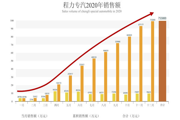 湖北程力公司在2020年初制定的專汽產值原本是完成70億目標,但隨著一場突如其來的疫情災害影響,直接停產一個半月,耽誤產值13億元;對此,以程阿羅總經理為首的高層團隊精準研判科學施策,面對疫情不畏困難,將沖刺目標調高到75億;一手抓疫情防控一手抓復工復產,積極應對逆勢而上,大膽創(chuàng)新及時推出高端負壓救護車、醫(yī)療廢棄物轉運車、疫情消毒車、應急搶險車、核酸取樣檢測車等適銷對路的緊缺產品,馳援全國及國際疫情防控第一線,與病毒擴散搶時間、奪戰(zhàn)場,把耽誤的時間補回來,把失去的市場占領回來。 2020年三月份以來,湖北程力專汽及應急產品的生產銷售一直持續(xù)快速的攀升,平均增長速度超過了20%,遙遙領先于同行業(yè)的其他生產廠家,高于歷史同期增長水平,打了一個漂亮的翻身仗,截止12月25日上午10:38分,專汽產值提前6天順利完成75.58億,交出了一份令人滿意的答卷。