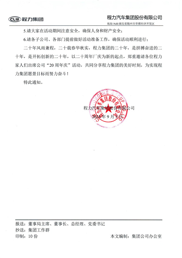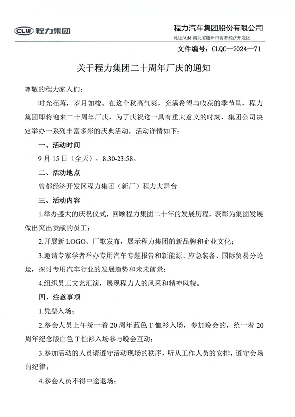 關(guān)于程力集團二十周年廠慶的通知 尊敬的程力家人們: 時光荏苒,歲月如梭。在這個秋高氣爽,充滿希望與收獲的季節(jié)里,程力集團即將迎來二十周年廠慶,為了慶祝這一具有重大意義的時刻,集團公司決定舉辦一系列豐富多彩的慶典活動,活動詳情如下: 一、活動時間 9月15日(全天),8:30-23:58。 二、活動地點 曾都經(jīng)濟開發(fā)區(qū)程力集團(新廠)程力大舞臺 ![]() 三、活動內(nèi)容 1.舉辦盛大的慶祝儀式,回顧程力集團二十年的發(fā)展歷程,表彰為集團發(fā)展做出突出貢獻的員工; 2.開展新LOGO、廠歌發(fā)布,展示程力集團的新品牌和企業(yè)文化; 3.邀請專家學(xué)者舉辦專用汽車專題報告和新能源、應(yīng)急裝備、國際貿(mào)易分論壇,探討專用汽車行業(yè)的發(fā)展趨勢和未來前景; 4.組織員工文藝匯演,展現(xiàn)程力人的風(fēng)采和精神風(fēng)貌。 四、注意事項 1.憑票入場; 2.參會人員上午統(tǒng)一著20周年藍色T恤衫入場,參加晚會的,統(tǒng)一著20 周年紀(jì)念版白色T恤衫入場參與晚會互動; 3.參加活動的人員請遵守活動現(xiàn)場的秩序,聽從工作人員的安排,遵守會場的紀(jì)律; 4.參會人員不得中途退場; 5.請大家在活動期間注意安全,確保人身和財產(chǎn)安全; 6.請各子公司、各部門提前做好活動準(zhǔn)備工作,確保活動順利進行; 二十年風(fēng)雨兼程,二十載春華秋實,程力集團的二十年,是拼搏奮進的二十年,是開拓創(chuàng)新的二十年,以二十周年廠慶為新的起點,鄭重邀請各位程力家人們出席公司“20周年慶”活動,共同分享程力集團的美好時刻,為實現(xiàn)程力集團愿景目標(biāo)而努力奮斗! 特此通知。 ![]() ![]() |