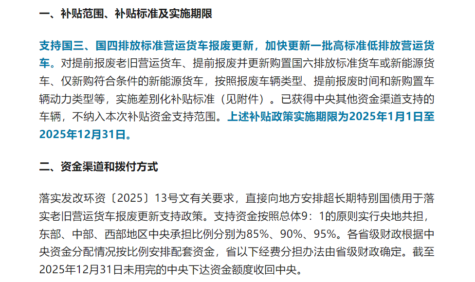 3月14日 深圳啟動以舊換新實施方案 深圳市發(fā)展和改革委員會、深圳市財政局關(guān)于印發(fā)2025年超長期特別國債資金加力擴圍支持消費品以舊換新實施方案的通知 ,明確指出,在2024年政策基礎(chǔ)上,將老舊營運貨車報廢更新補貼范圍擴大至國四排放標(biāo)準(zhǔn)營運貨車。對提前報廢國四及以下排放標(biāo)準(zhǔn)營運柴油貨車,平均每輛補貼3萬元;提前報廢并新購國六排放標(biāo)準(zhǔn)貨車或新能源貨車,平均每輛補貼8萬元;僅新購新能源城市冷鏈配送貨車,每輛補貼3.5萬元。