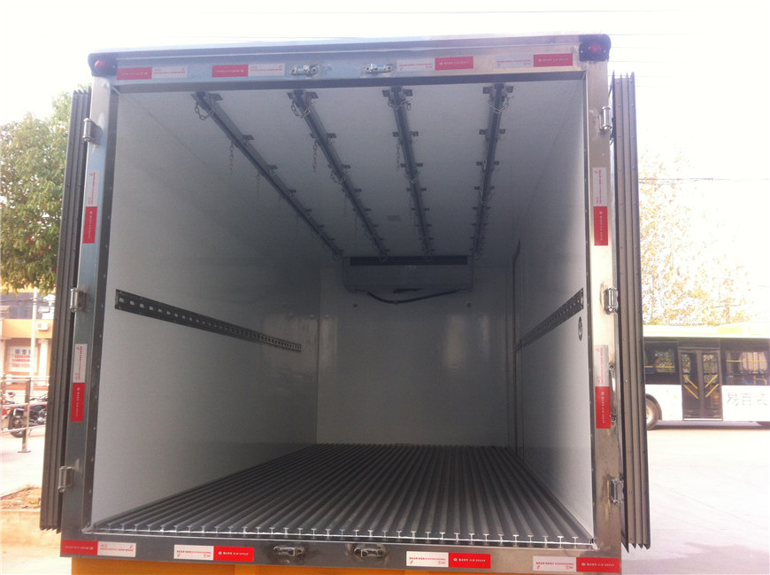 二,保溫箱體 湖北程力冷藏車(chē)的質(zhì)量好不好一般因素是看箱體的質(zhì)量,好的冷藏車(chē)箱體不漏熱,質(zhì)量輕,箱體結(jié)實(shí)不變形起泡。湖北程力公司自主研發(fā)的冷藏車(chē)第五代產(chǎn)品融合:"無(wú)縫結(jié)合箱體技術(shù)”,“全自動(dòng)恒溫系統(tǒng)”,“全方位冷藏車(chē)監(jiān)控系統(tǒng)”,“全球冷凍數(shù)據(jù)回饋技術(shù)”,箱體填充除了保留傳統(tǒng)的“高密度聚氨酯”外,新增“航空材質(zhì)高密度玻璃纖維”。廂板為三明治式結(jié)構(gòu),內(nèi)外蒙皮,中間輕鋼龍骨架及8厘米高密度聚氨酯保溫材料,采用國(guó)際先進(jìn)的大型真空負(fù)壓機(jī)一次性負(fù)壓成型,表面光潔平整,強(qiáng)度高,整體質(zhì)量輕,保溫性能良好,無(wú)滲漏。箱體內(nèi)外蒙皮可根據(jù)用戶的實(shí)際需求選用玻璃鋼板,鋁合金板,彩鋼板,不銹鋼板等材質(zhì)制作。用戶也可以根據(jù)運(yùn)輸介質(zhì)的不同選裝滑道,肉鉤,通風(fēng)槽,側(cè)開(kāi)門(mén)等。