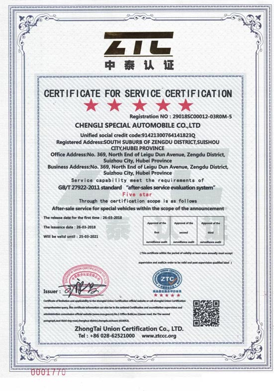 近日,程力汽車集團股份有限公司全面加強產品質量和售后服務管理工作,為企業高質增長提供可靠保障,集團公司旗下核心企業----程力專用汽車股份有限公司,經過申報、考核、驗廠,專家調研評審等嚴格評審程序,取得了國家級五星服務認證認可。 該認證是對程力公司產品質量和售后服務的全面達標的認可,也是產品占領和擴大市場份額的通行證和利器,五星級認證的獲得對產品在招投標中將起到積極的作用,是必不可少的加分事項,程力專汽也必將由此獲得更大更好的發展。 獲得五星級售后服務認證的證書如下: ![]() ![]() |