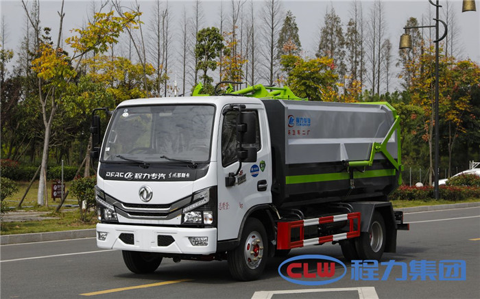 湖北程力國六東風多利卡5方掛桶垃圾車(不帶壓縮)程力威牌CLW5071ZZZD6型自裝卸式垃圾車廠家配置: 底盤配置:東風小多利卡國六5方掛桶垃圾車(不帶壓縮),采用東風原裝底盤,D6系列新款駕駛室,采用東風朝柴升級版CY4BK461國六排放發動機,95KW,130匹大馬力,萬里揚5擋變速箱,7.00鋼絲胎,國六車輛在國五基礎上增加了DPF顆粒捕捉器,多功能方向盤。 掛桶垃圾車是由密封式垃圾廂、液壓系統、操作系統組成,實現一車與多個垃圾桶聯合作業,廂體上的液壓提升機裝置可將垃圾桶吊上、放下,上下升降。箱體采用Q235碳鋼板焊接而成,小多利卡、大多利卡為邊3底4mm厚度,3950軸距以上為邊4底5mm厚度,箱體底部油缸舉升自卸,側面提升機可選鏈條式、拉桿式,后門手動開啟加裝手電一體加一千,箱體加厚請電議。 湖北程力國六東風多利卡5方掛桶垃圾車(不帶壓縮)程力威牌CLW5071ZZZD6型自裝卸式垃圾車多方位圖片;