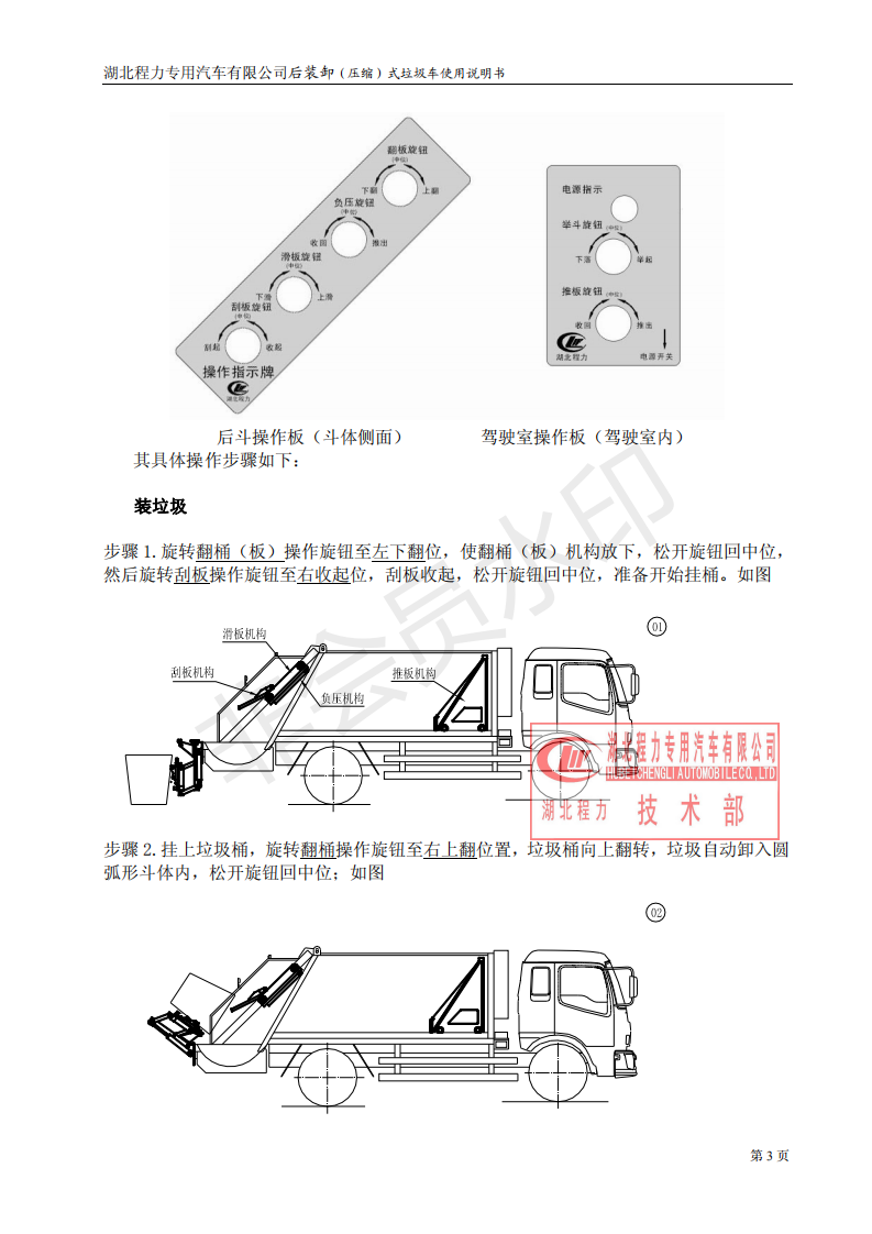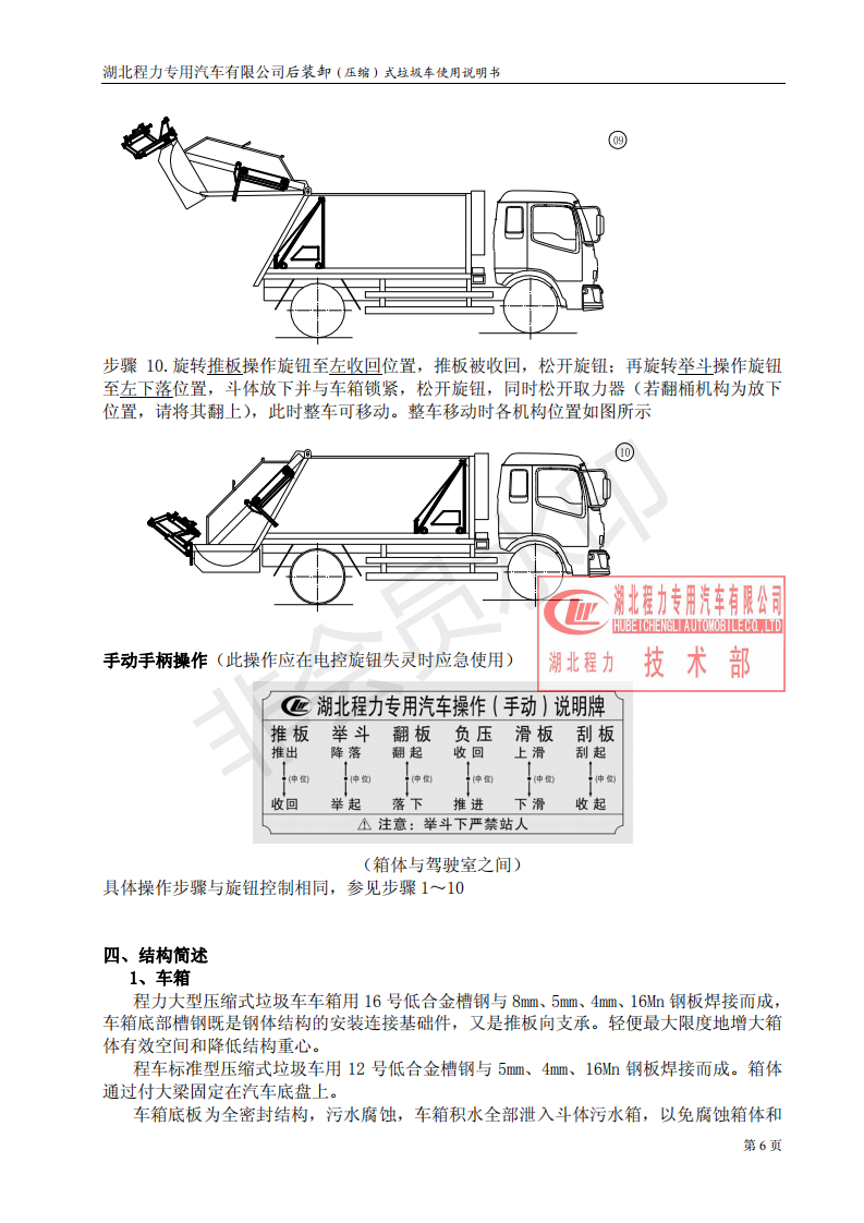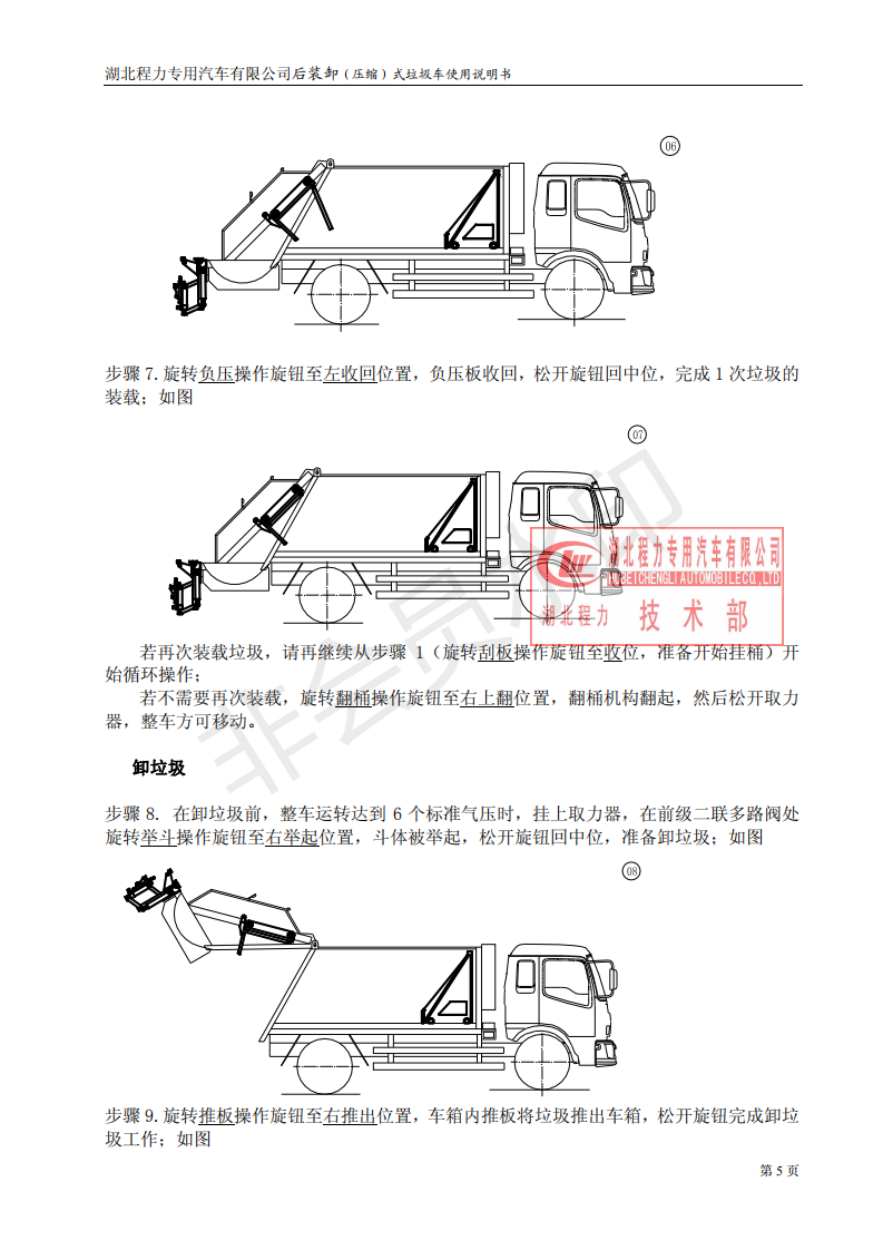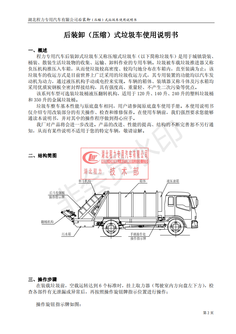 湖北程力壓縮垃圾車由密封式垃圾廂、液壓系統(tǒng)、操作系統(tǒng)組成。壓縮垃圾車整車為全密封型,自行壓縮、自行傾倒、壓縮過程中的污水全部進(jìn)入污水廂,較為徹底的解決了壓縮車運(yùn)輸過程中的二次污染的問題,關(guān)鍵部件采用進(jìn)口部件,具有壓力大、密封性好、操作方便、安全等優(yōu)點(diǎn)。
