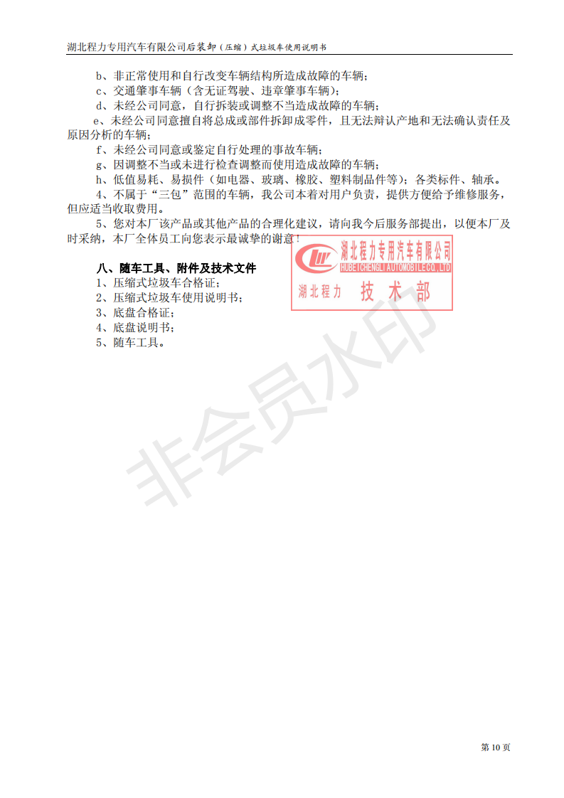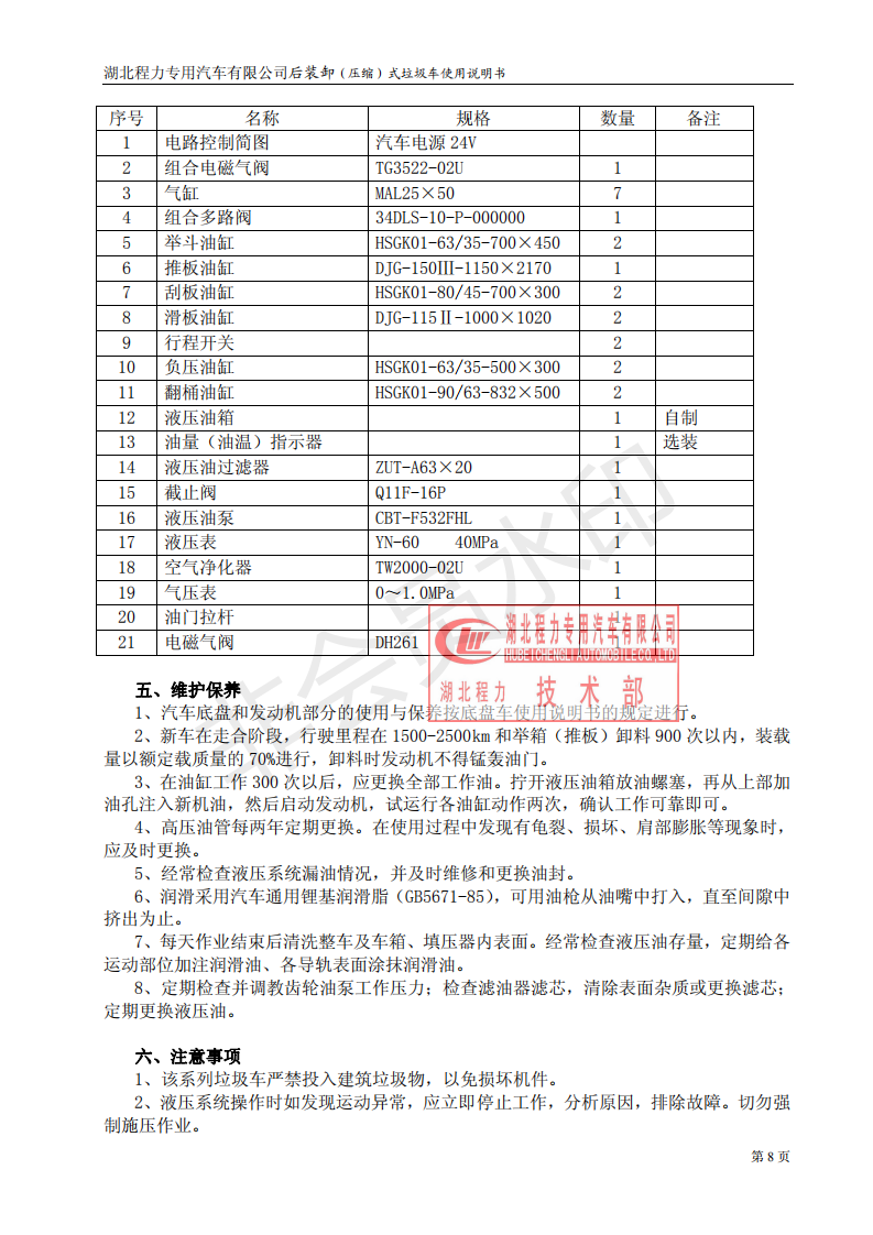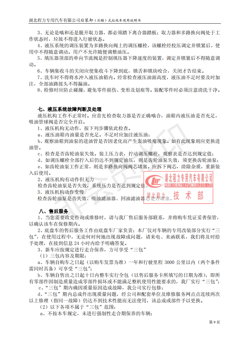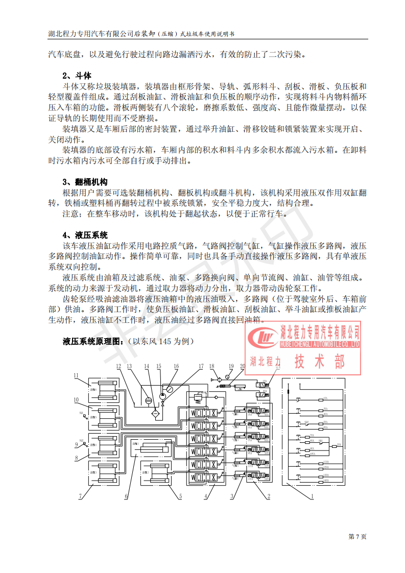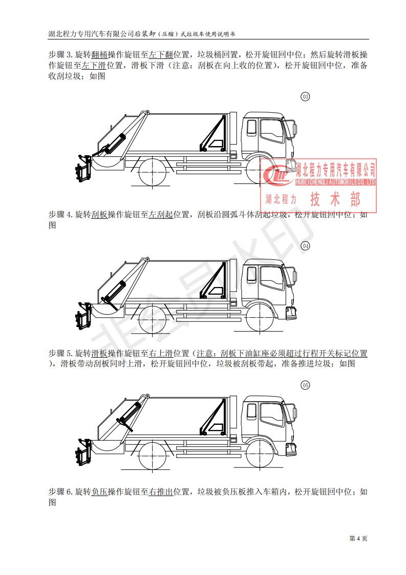 湖北程力壓縮垃圾車由密封式垃圾廂、液壓系統(tǒng)、操作系統(tǒng)組成。壓縮垃圾車整車為全密封型,自行壓縮、自行傾倒、壓縮過程中的污水全部進(jìn)入污水廂,較為徹底的解決了壓縮車運(yùn)輸過程中的二次污染的問題,關(guān)鍵部件采用進(jìn)口部件,具有壓力大、密封性好、操作方便、安全等優(yōu)點(diǎn)。