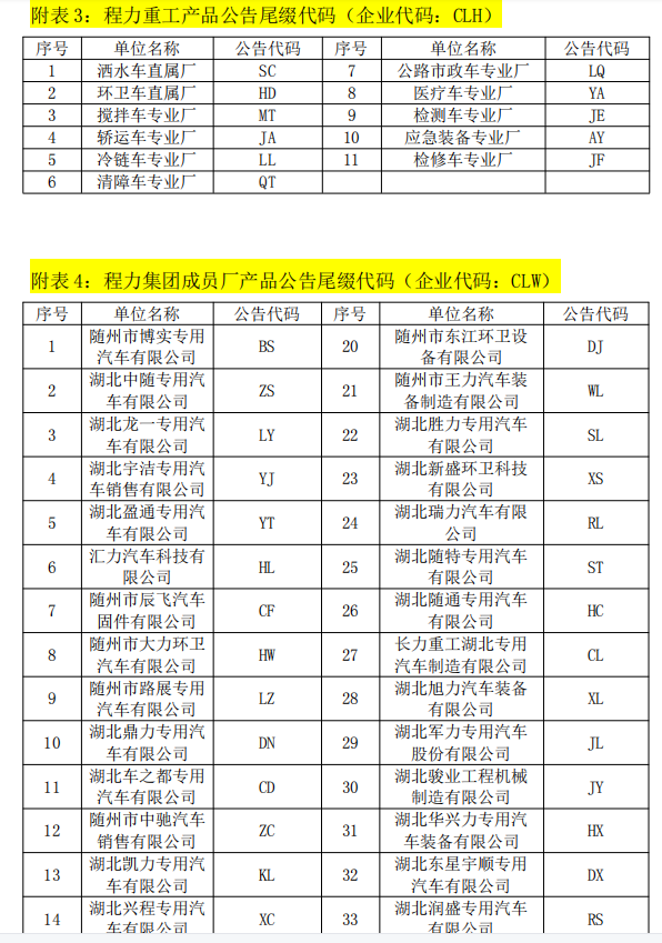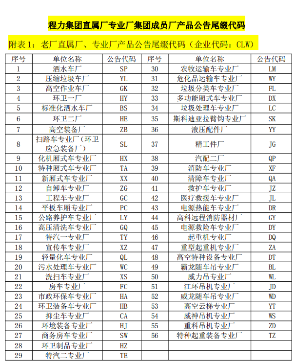 程力重工產(chǎn)品公告尾綴代碼(企業(yè)代碼:CLH),程力集團成員廠產(chǎn)品公告尾綴代碼(企業(yè)代碼:CLW)