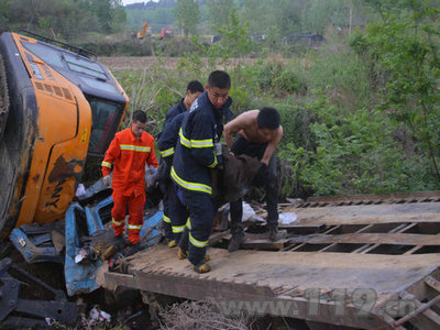 消防官兵到達現場后,發現一輛貨車車頭直接扎入溝中,在貨車上的挖掘機側翻在一旁,當地派出所及120急救人員已經趕到了現場。見此情形,消防官兵迅速展開營救,但由于貨車狠狠的撞在田埂上,駕駛室已經嚴重變形,消防官兵利用液壓剪擴鉗、液壓撐頂器等破拆工具均未能使駕駛室有效擴張,而且挖掘機隨時有壓下來的危險。于是,中隊指揮員立即協調公安部門,將附近的一輛挖掘機借調過來,配合消防官兵實施營救。 挖掘機到位后,指揮員立即下令挖掘機將貨車車身往后牽引,使車頭留有救援空間供消防官兵救援。命令下達后,救援人員各司其職,迅速的投入到戰斗中去。 19時05分,通過消防官兵1個多小時的緊張救援,貨車司機被成功救出,但由于撞擊嚴重,被困時間過長,醫 |
