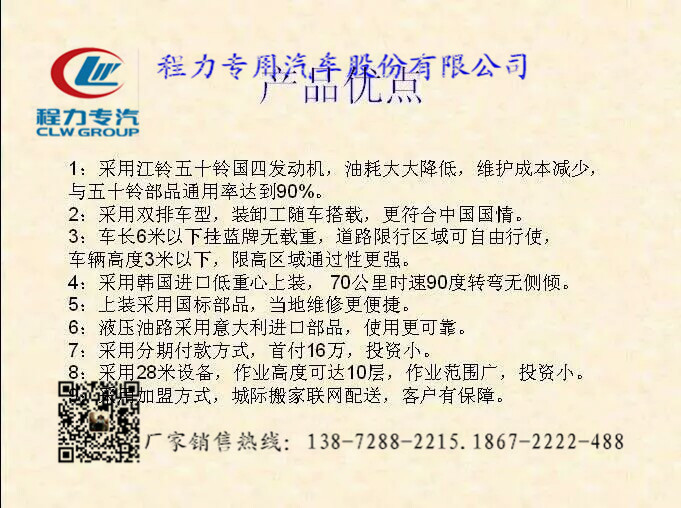 程力公司程力威牌云梯搬家車作業高度可達28米,相當于10層樓高,云梯車的承載貨物重量每次可達300公斤,藍色牌照,C證駕駛室,無需特種操作證。非營運車輛,使用期限30年。云梯從韓國進口,底盤有東風雙排座和江鈴雙排座兩種供用戶選購。廠家銷售熱線:0722-3220988.0722-7029866 |