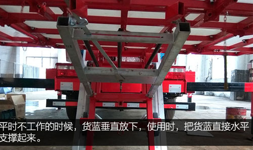 平時不工作的時候,貨藍垂直放下,使用時,把貨藍直接水平支撐起來。里面的黑色管路專門用于支撐貨藍的小液壓油缸。