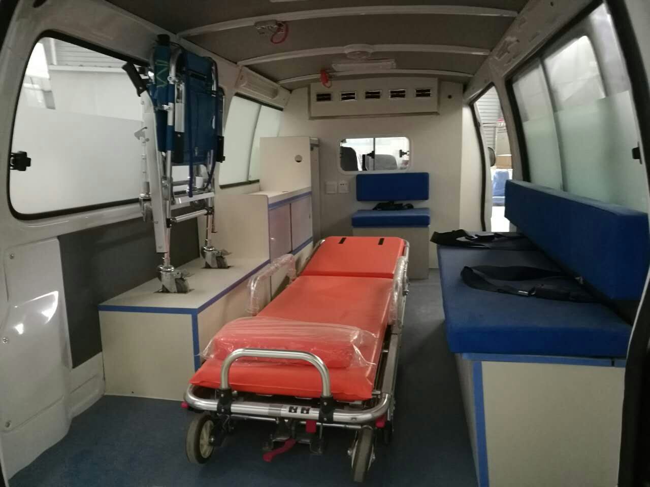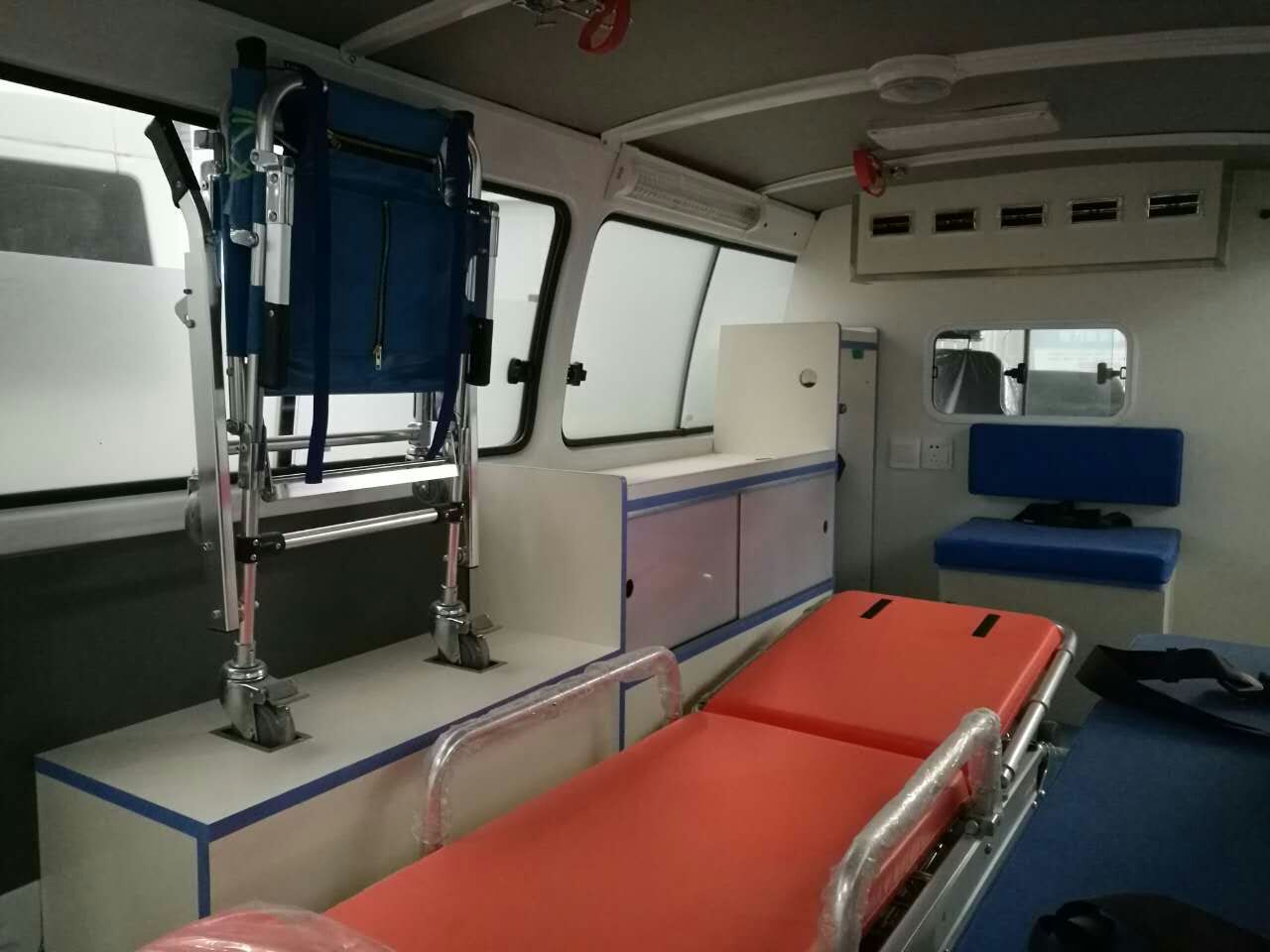 1、便攜折疊式擔架1件;2、醫藥柜1件;3、固定安裝氧氣瓶1只;4、輸液吊鉤2只;5、消毒燈1只;6、污物桶1只;7、單人座椅3只;8、長條貯藏柜帶2人位軟座墊、軟靠背和安全帶1套;9、中隔斷帶鋁合金滑窗1套;10、前頂裝全藍警燈警報器1套;11、照明燈2只;12、逆變器1只;13、電源插座1組;14、中門上車扶手;15、后門上車踏板;16、醫用耐磨塑膠地板革;17、貼救護十字標志;廠家銷售熱線:13872882215.