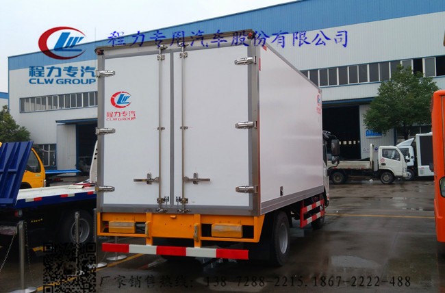 2.上裝配置:廂體內部有效尺寸:單排長4.015米(排半長3.685米)×寬2.06米×高2米,廂體蒙皮采用內外玻璃鋼,隨客戶選擇內置槽鋼焊接骨架或者玻璃纖維超輕高強度骨架,填充8cm聚氨酯保溫層,不銹鋼包角,不銹鋼門框,不銹鋼門鎖件,防滑花紋鋁底板,配后雙開門,車廂右側可以加開側門-5或者-18度制冷機組