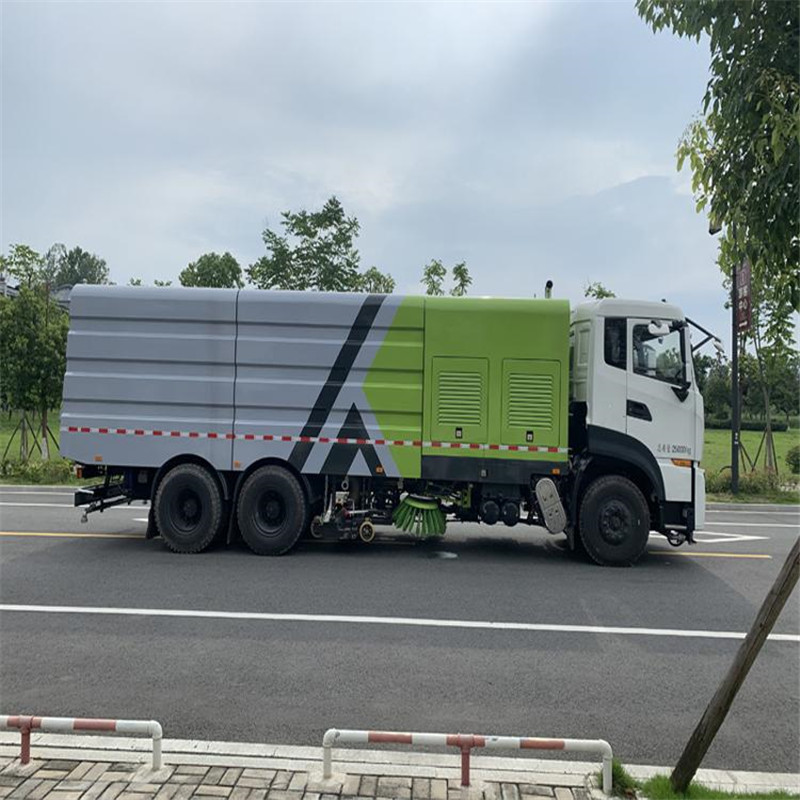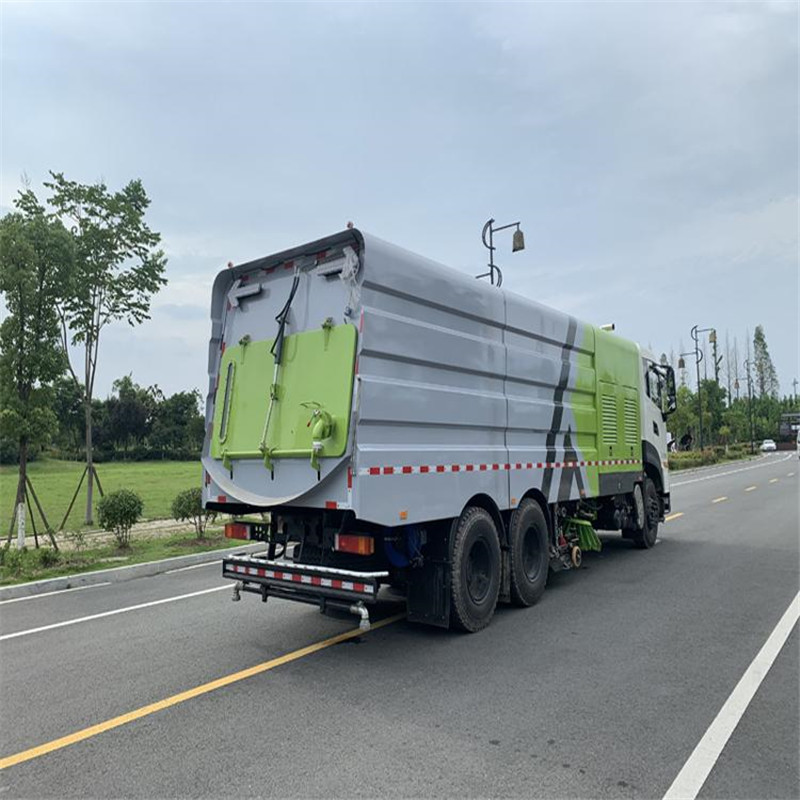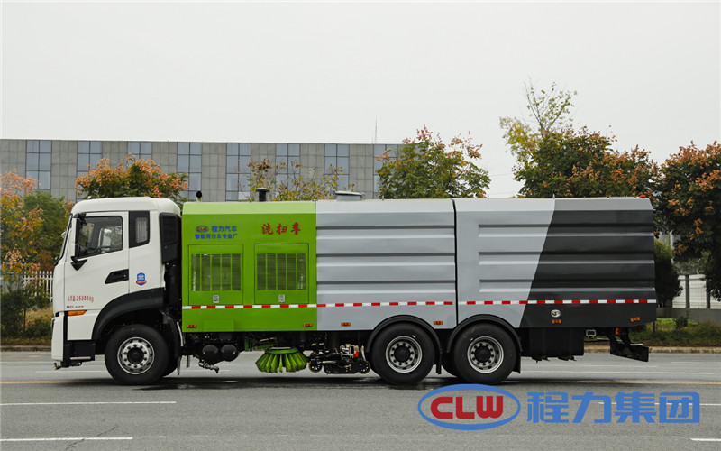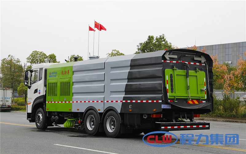 東風(fēng)天龍洗掃車(chē)副發(fā)動(dòng)機(jī)驅(qū)動(dòng)風(fēng)機(jī)和高壓水泵,副發(fā)動(dòng)機(jī)采用東風(fēng)康明期6缸柴油發(fā)動(dòng)機(jī)。 風(fēng)機(jī)用8.0高壓離心風(fēng)機(jī),效率高、風(fēng)量大,最高風(fēng)量達(dá)23500m3/h。 東風(fēng)天龍洗掃車(chē)高壓水泵采用同際知名T7012IR 型柱塞柱,流量合適,壓力高,允許最高壓力達(dá)10MPa,清水箱充分利用了車(chē)載空間,容積大,容積達(dá)12m3。 東風(fēng)天龍洗掃車(chē)?yán)洳捎脝螌硬讳P鋼結(jié)構(gòu),傾翻卸料,帶高壓位自潔裝置。自潔裝置可在垃圾箱卸料時(shí)幫助卸料,清洗垃圾箱內(nèi)部。 東風(fēng)天龍洗掃車(chē)左右立掃為單掃盤(pán),減少了掃刷數(shù)量和掃刷消耗量,能降低使用成本。左右立掃分開(kāi)控制,可實(shí)現(xiàn)左掃、右掃和全掃等不同作業(yè)模式。寬吸嘴的吸口寬度達(dá)到2418mm,確保作業(yè)總寬度大于3.5mm。 湖北程力國(guó)六東風(fēng)天龍后雙橋大型洗掃4個(gè)高度可調(diào)的吸嘴輪,能方面調(diào)整和保證吸嘴與路面間的合理間隙。吸嘴內(nèi)高有噴水桿,盡可能多地將高壓洗滌噴嘴布置在吸嘴內(nèi)部,不但清洗效果好,還能最大限度減少高壓水氣流沖起污物產(chǎn)生的二次污染。左右噴水桿安裝在吸嘴上,隨吸嘴升降,結(jié)構(gòu)簡(jiǎn)單緊湊,保證噴水桿的離地高度固定不變,達(dá)到最佳清洗效果。 東風(fēng)天龍洗掃車(chē)開(kāi)式液壓系統(tǒng)驅(qū)動(dòng)左右立掃升降、左右掃肋旋轉(zhuǎn)、吸嘴升降、垃圾箱后門(mén)開(kāi)閉、垃圾箱傾翻復(fù)位等機(jī)械動(dòng)作。底盤(pán)變速箱側(cè)取力器驅(qū)動(dòng)低壓水泵,實(shí)現(xiàn)灑水車(chē)的低壓沖洗功能。一鍵式作業(yè)起動(dòng)和停機(jī)操作。 東風(fēng)天龍大型洗掃車(chē)具有路面清洗、路面清掃、路緣清洗、路緣和路緣石立面洗刷、低壓沖洗、噴霧除塵等多功能。有“全洗掃”、 “左洗掃”、 “右洗掃”、 “全掃”、 “左掃”、 “右掃”6種作業(yè)模式可選擇。選擇“全洗掃”模式清洗廣場(chǎng)和路面,清洗效率高效果好,洗凈率達(dá)90%以上。選擇“左洗掃”或“右洗掃”模式清洗路面和路緣、洗刷路緣石立面。需要進(jìn)行路面清掃或路面保潔作業(yè)時(shí),可選擇掃路模式。需要噴霧除塵時(shí),可開(kāi)啟噴霧裝置,進(jìn)行噴霧除塵作業(yè)。可以像灑水車(chē)一樣對(duì)路面進(jìn)行低壓沖洗作業(yè)。 東風(fēng)天龍大型洗掃車(chē)適用于城市道路、高速公路、廣場(chǎng)、機(jī)場(chǎng)、碼頭、遂道、橋梁、隔離墻避、路緣和路緣石立面的機(jī)械化清洗、清掃、噴霧降塵等清潔作業(yè)。
