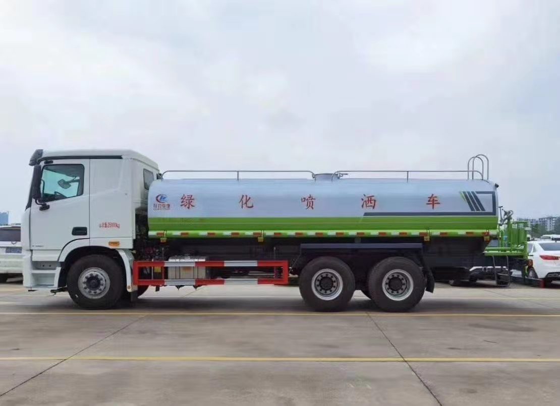 湖北程力國(guó)六歐曼后雙橋18-20方綠化噴灑車(灑水車)程力威牌CLW5250GPSBDP型綠化噴灑車廠家配置: 湖北程力國(guó)六福田歐曼GTL后雙橋20噸灑水車底盤(pán)配置:采用福田歐曼后雙橋原裝底盤(pán),福田歐曼GTL豪華駕駛室,4400+1350mm軸距,搭載國(guó)六(國(guó)Ⅵ)東風(fēng)康明斯260馬力柴油發(fā)動(dòng)機(jī),功率191kw,國(guó)六排放,陜齒法士特八檔變速箱,11.00R20鋼絲胎,前橋5T,后橋雙10T,方向助力,斷氣剎,排氣制動(dòng),原裝空調(diào),行駛記錄儀,多媒體顯示屏,電動(dòng)門窗,中控鎖,氣囊座椅,ABS。 湖北程力國(guó)六福田歐曼GTL后雙橋20方灑水車專用配置:罐體容積:18立方米,罐體鋼板為5mm碳鋼Q235材質(zhì)專用容積板一次成型,罐內(nèi)隔板具有防波作用,以減輕汽車行駛時(shí)罐體液體沖擊;配大功率專用灑水泵,泵可自吸自排;整車前沖、后灑、側(cè)噴、后平臺(tái)帶綠化灑水炮,灑水炮可全方位旋轉(zhuǎn),可連續(xù)調(diào)成直沖狀、大雨、小雨、毛毛雨;前封頭帶水位計(jì),后平臺(tái)主管路帶1寸澆花接口,后爬梯,帶1個(gè)消防接頭,帶1個(gè)自流閥,1個(gè)過(guò)濾裝置。